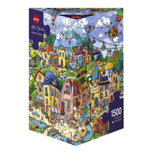 "Happytown" by Heye is a picture of the perfect place to call home, that is if you're a reasonably responsible domestic animal (the minimal qualifications for living in Happytown). Houses are well kept, crime rates are low, and leisure opportunities abound. Everything from water sports to snow skiing to hot-air ballooning, in fact every good thing, abounds in Happytown. We especially like the architecture of the buildings and the bright mix of colours. The artist has done a fine job designing a fun and happy puzzle that should prove especially satisfying to any lover of great cartoon puzzles.