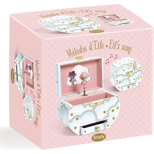 Turn the crank, open the box and surprise! Elfe, a delicate and finely sculpted figurine, dances and turns to the tune Carl Maria von Weber's "Invitation to the Dance", casting her reflection in a cloud-shaped mirror. Elfe is a fairy-like character from the Tinly range from Djeco.