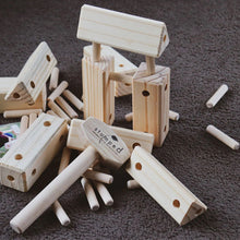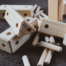 4 wooden blocks, 5 triangle wooden blocks, 30 wooden dowels, 1 Stumped wooden hammer
